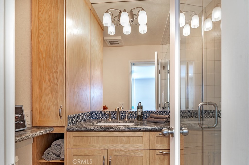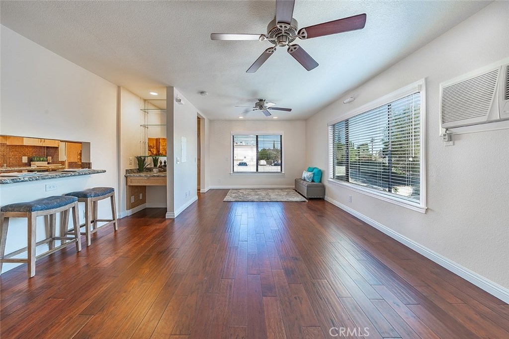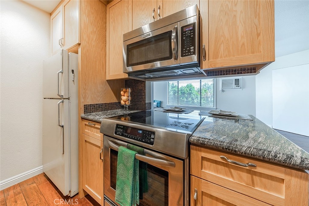 Welcome to this completely and tastefully remodeled spacious end unit studio condo. Brand new kitchen cabinetry, granite counter tops, custom backsplash and stainless steel appliances and breakfast counter. Dining room has custom storage cabinets. A granite desk/computer work station with shelving. New windows and blinds. The unit is hardwired for surround sound. The bathroom has all new custom tile work and cabinetry with newer glass door enclosure. The living area is spacious and can be easily divided. There are two nice sized closets in hallway leading to bathroom. A newer energy efficient A/C unit and two new ceiling fans. The newer engineered hardwood floor is the perfect touch to this bright and spacious unit.
