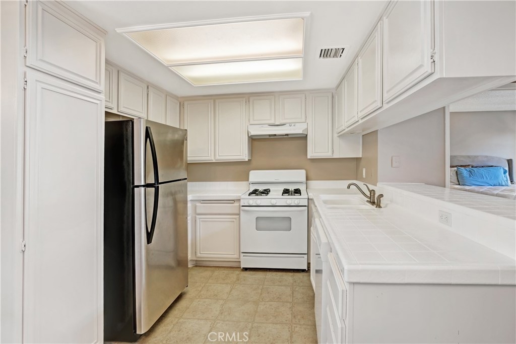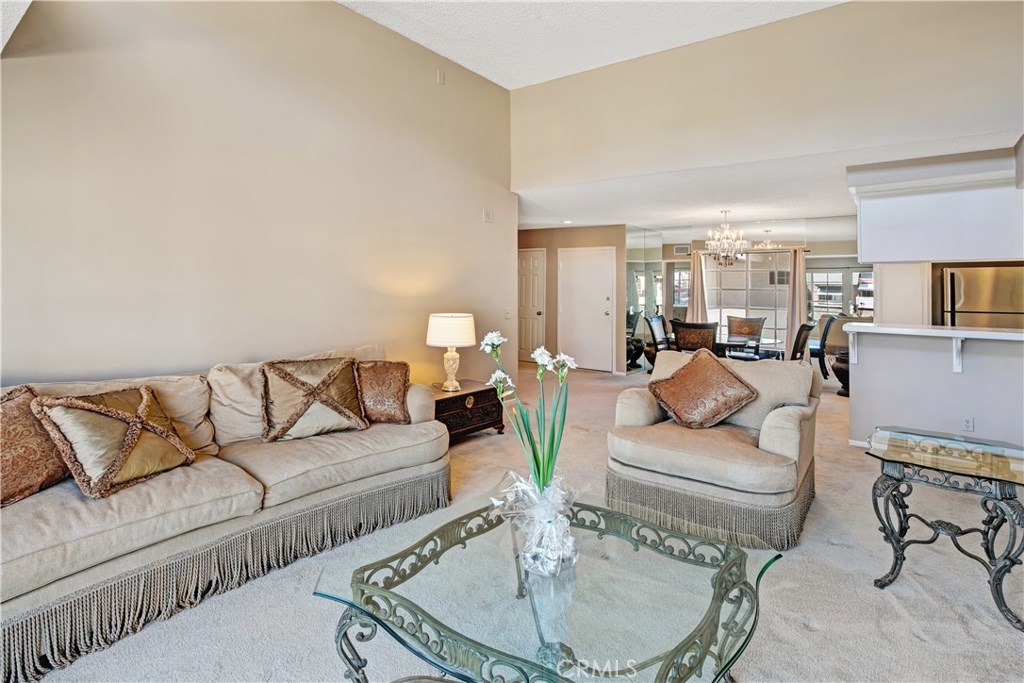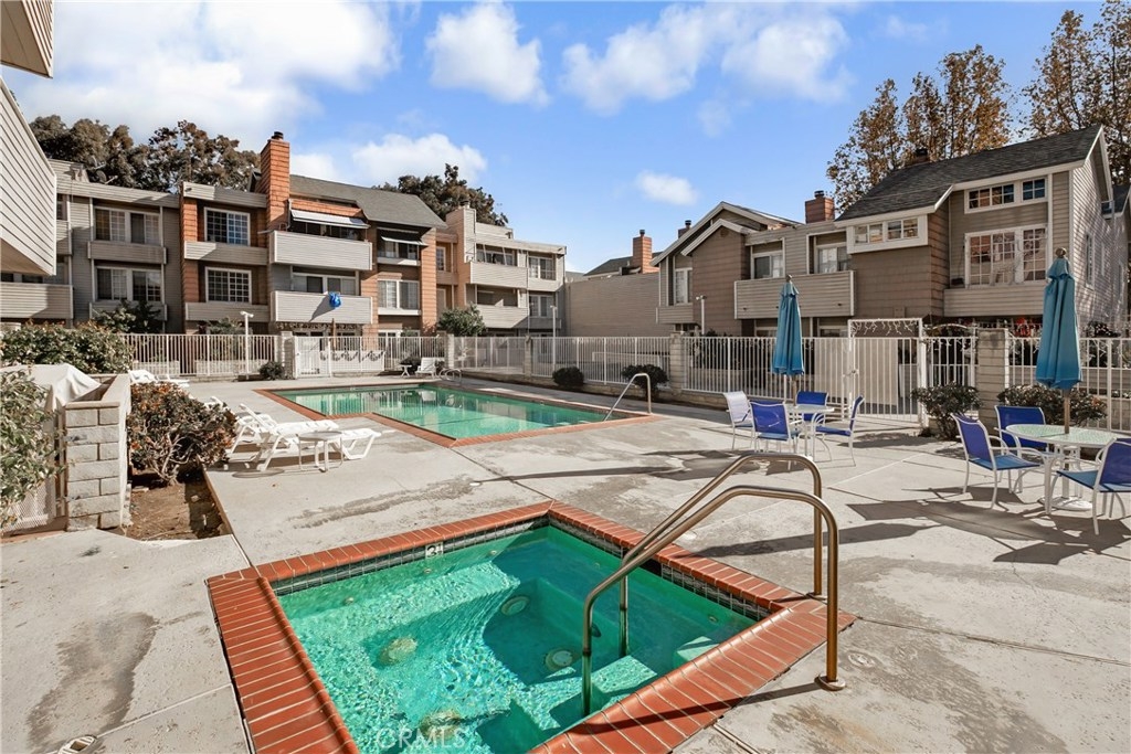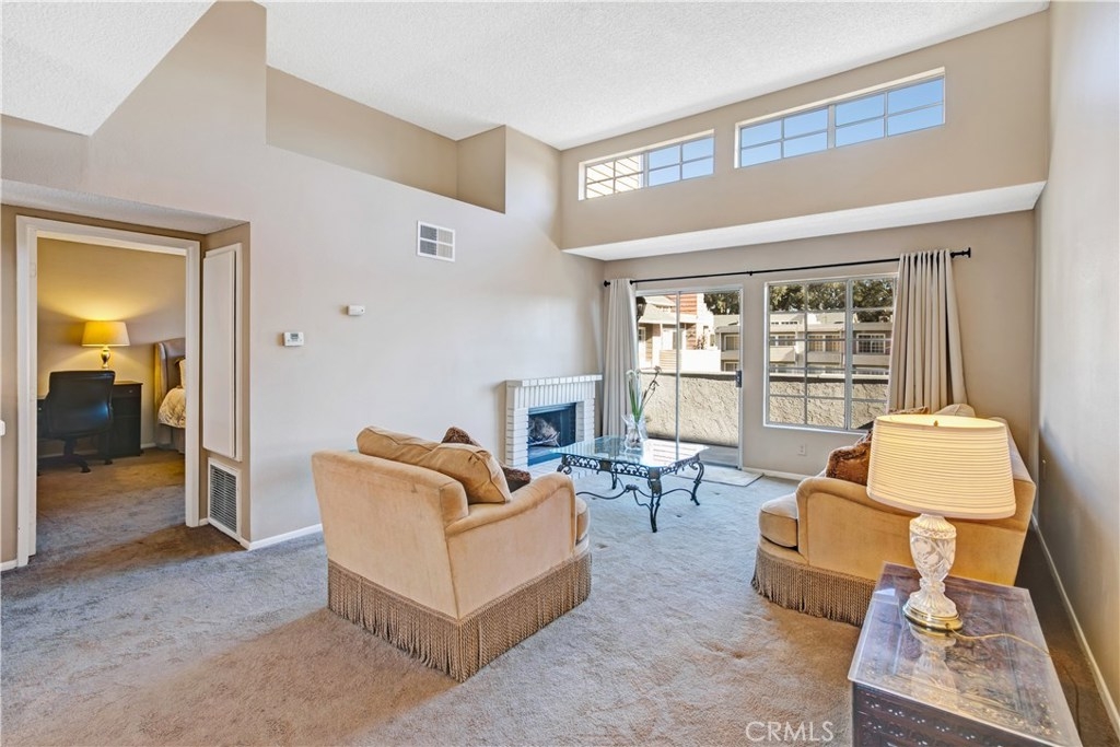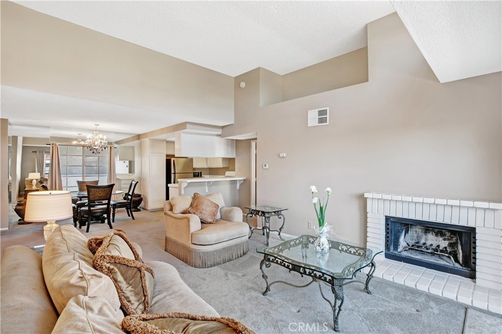 Spacious 1-story with 2 bedroom, 2 bath condominium in the highly desired Keswick Villas. This exceptional home features over 1,000 square feet filled with natural light and an open floor plan. Living room boasts soaring high ceilings, cozy brick fireplace and sliding glass door to the private balcony overlooking the pool, perfect for entertaining. Immaculate kitchen with tons of cabinet and counter space and a breakfast bar. Large en-suite master bedroom with his and her closets. Second bedroom includes large closet and view of pool. Both bedrooms are on opposite sides of the unit giving added privacy to each room. Separate laundry room inside the unit with built-in shelving. Features of the complex are secure underground parking, fully gated and access controlled, sparkling pool and spa. Close to shopping and dining.