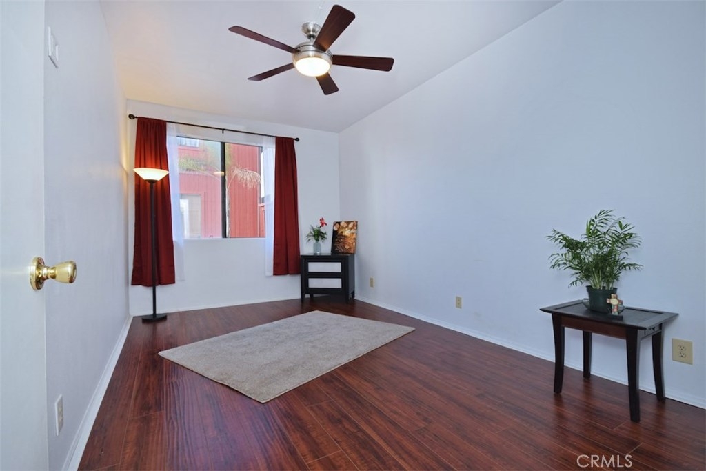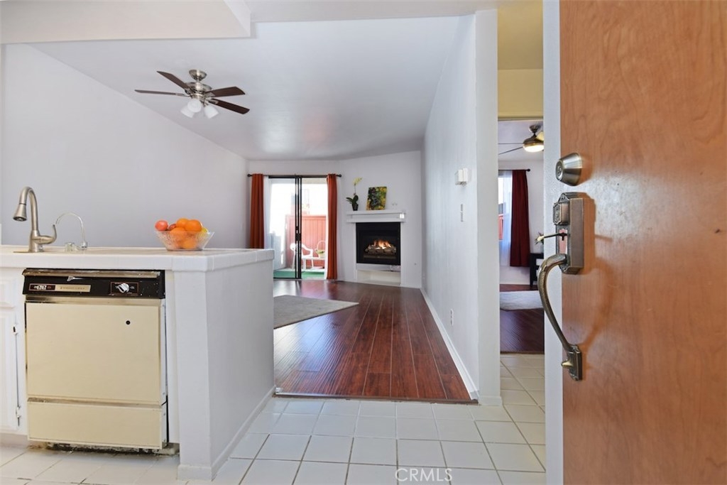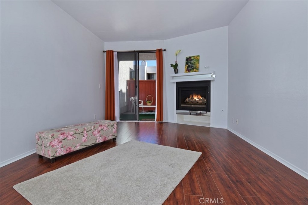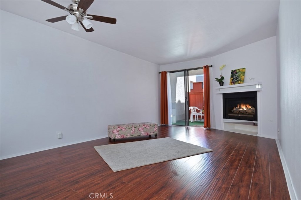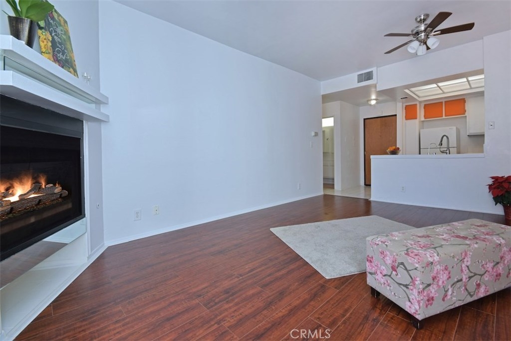 WHY RENT!!! Light and Bright wonderful unit in Gated Secured Condo complex. One of the best locations within the complex with huge patio. First floor unit with beautiful newer flooring, living room with cozy fireplace open to the kitchen with high ceilings. Sliding glass doors lead you to a very private entertainers patio with privacy, yet close to the big open pool area with spa and lounge furniture to enjoy the hot summer days in a resort like style. Central air and Heat, newer light fixture, newer window treatments. Large bedroom with walk-in closet, bathroom with tub and shower and newer light fixture. The complex has a pool, spa, laundry room, large recreational room for meetings and celebrations. The unit has 2 parking spots and additional storage area. This is a unique opportunity.