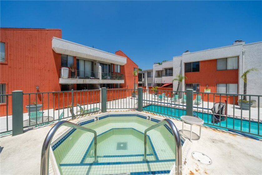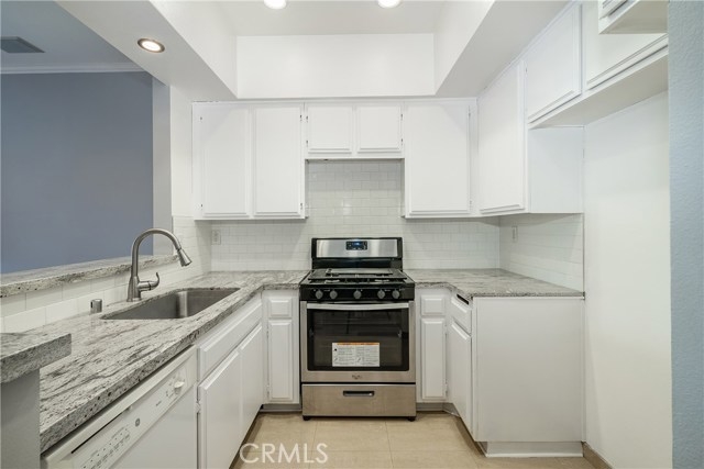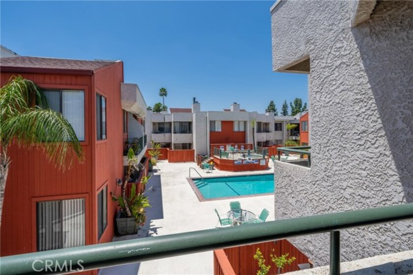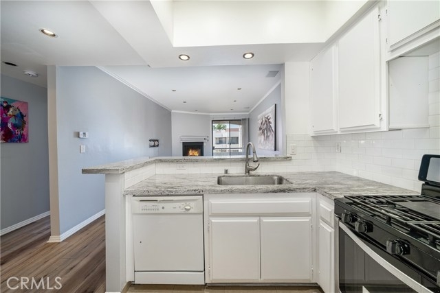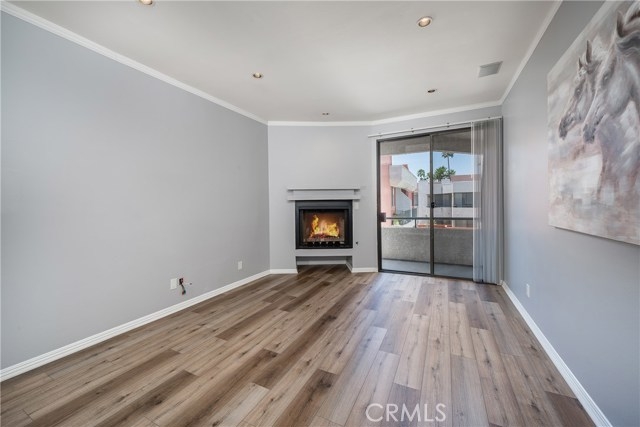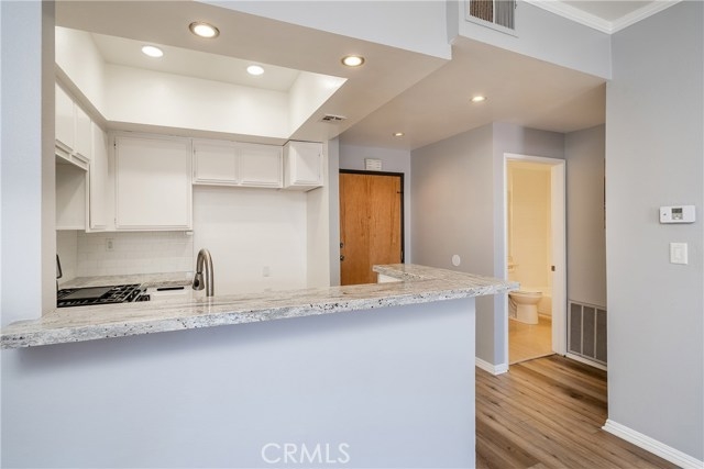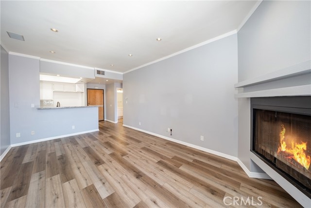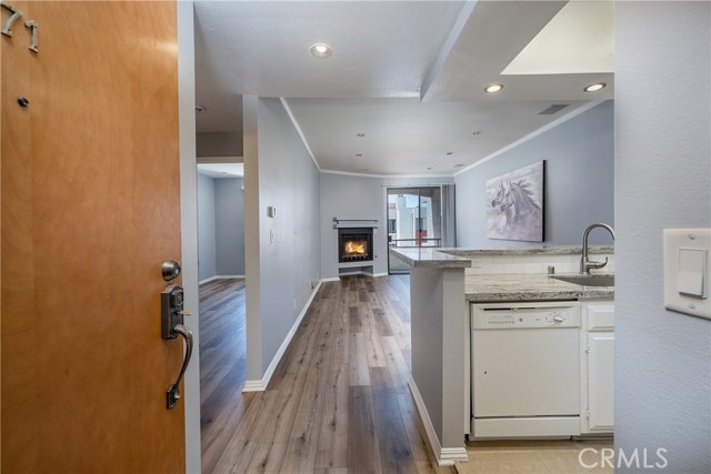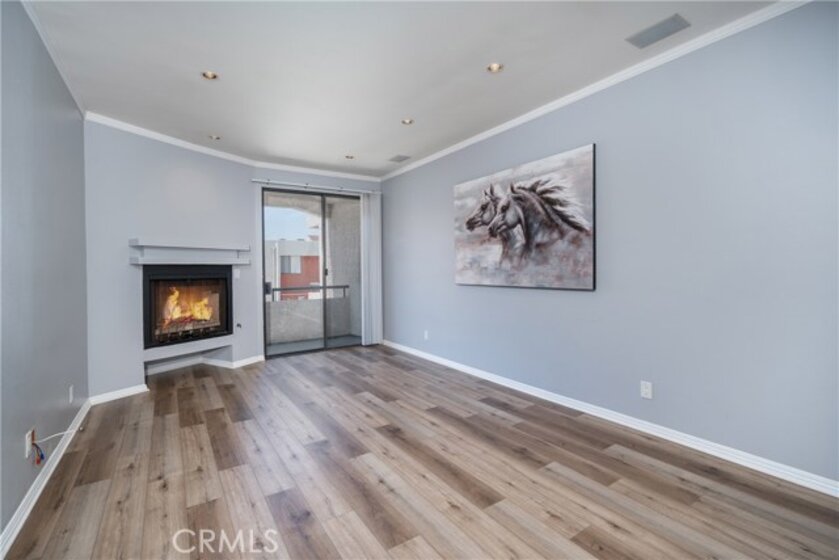 Great Remodeled 1 Bedroom & 1 Bath unit with engineered laminate wood flooring throughout. Kitchen with Granite counter tops, Stainless Steel Range Farm Sink & Ice Maker Valve. High Ceilings with 4"LED lights on dimmers. Living Room with gas Fireplace. Balcony over-looks Pool & has natural gas BBQ hookup. Bedroom has walk-in-closet. Bathroom with white subway tiles on tub. Recessed lights, crown molding & A/C & Heat. Top unit so no-one above you! TURNKEY! Move-right-in! HOA includes water, cable, Earthquake Insurance, outdoor Pool & Spa and Courtyard, fitness room, recreation room, elevator & laundry room. Parking space has storage unit in a gated Garage. Plenty of Visitor parking. Great location minutes away from Westfield Mall & The Village.