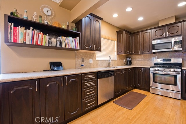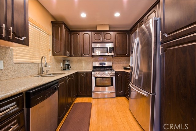 Beautiful 4 bedroom, 2.5 bath Townhouse that feels like resort style living! Remodeled Chefs Kitchen with Custom Cabinets, Granite Countertops and Backsplash include top of the line Stainless Steel Appliances and additional seating area that is light and bright. Elevated Formal Dining Room, perfect for entertaining is overlooking an Open Living Room with Plantation Shutters and beautiful Bamboo Wood Flooring throughout, High Ceiling and a Gas Burning Fireplace. Upstairs is a Spacious Master Bedroom Suite with His & Hers Walk-in Closets, Private Bath, Separate Toilet, Dual Vanities and Balcony. 2 more Bedrooms and one Full Bath are upstairs as well. The large Bonus Room is perfect for a secluded work area, a game or guest room. The front Entry offers a Private Patio, perfect for weekend grill outs! This Townhome is conveniently located in the quiet part of the building. The complex features a fenced Swimming Pool, Jacuzzi, Sauna, Tennis Court and a Children's Play Area. Beautifully maintained grounds in friendly setting. Attached 2 car garage with automatic access, Laundry and built-in storage. Entrance on OSO AVE.