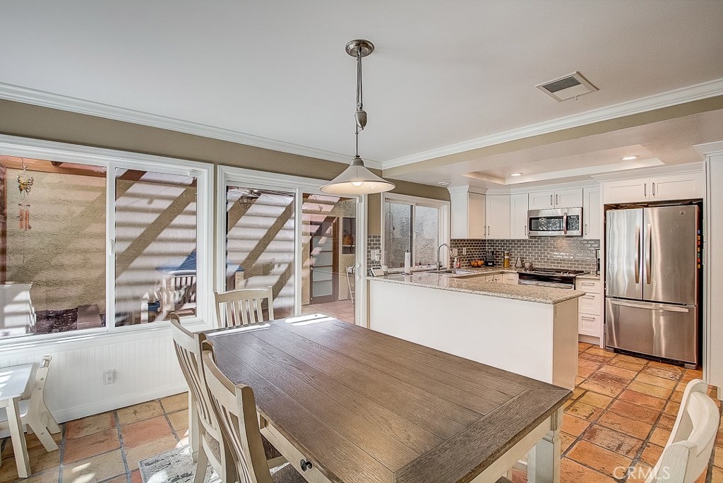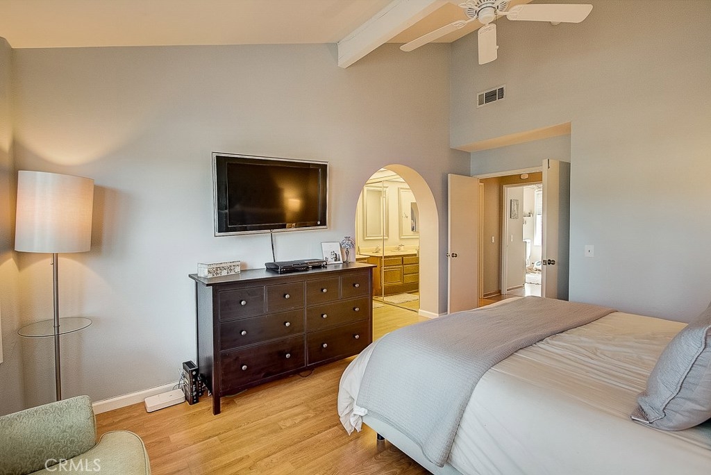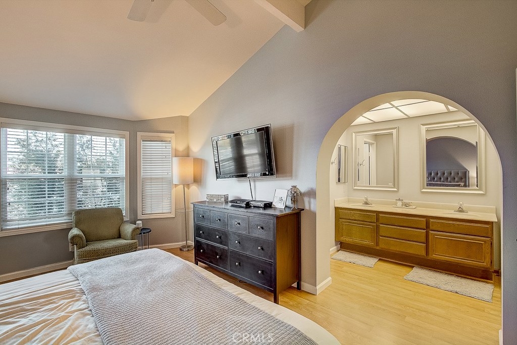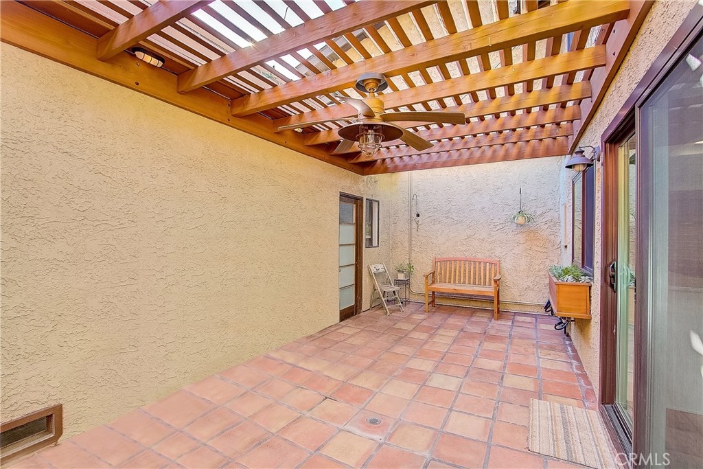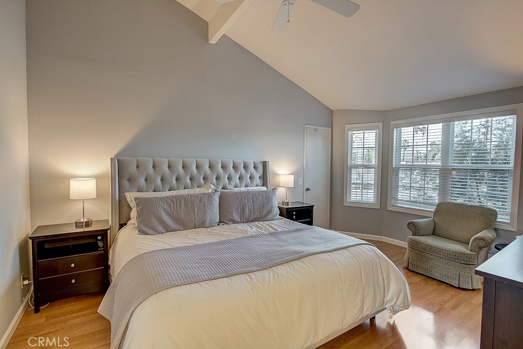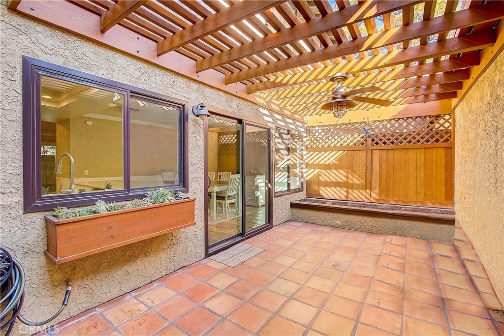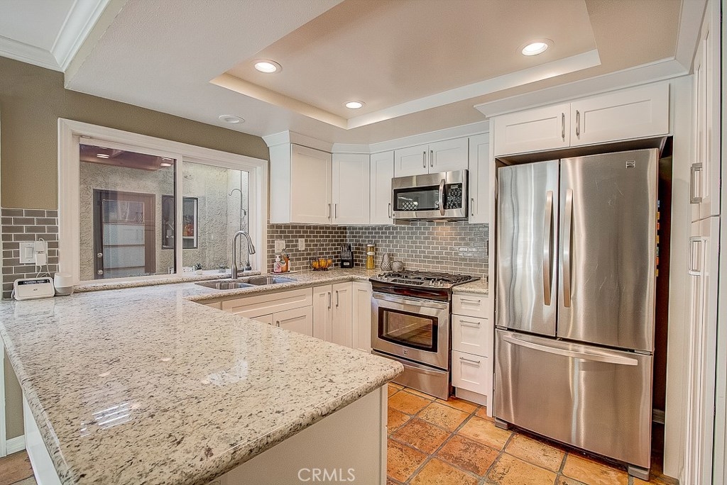 Many upgrades and designer touches featured in this spacious and stylish three-bedroom townhouse unit. Sleek, updated kitchen with quartz countertops, modern white cabinetry and recessed lighting. Newer bathroom renovations feature elegant tile and cabinetry. Spanish tile flooring flows from downstairs living spaces onto the generous-sized back patio leading to the two-car garage with laundry. Stacked stone gas fireplace, beautiful light fixtures, master suite with high beamed ceiling and insulted windows and sliders throughout. Landscaped front patio with water feature. Complex features gated and private pool area and guest parking. Convenient, central Valley location near shopping and schools. Everything you need to make this your next home!