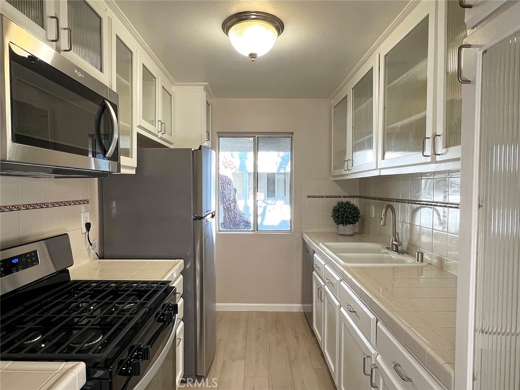 Amazing Remodeled & Updated Home in the Westside Community of Winnetka. Gated and Private Location! Upgrades include New Flooring throughout, Reglazed Tubs & New Shower Doors! Enjoy a Clean & Bright Kitchen with New Stainless Steel Stove, SS Microwave, SS Dishwasher and SS Refrigerator included! Beautiful cabinets with handles and tile backsplash. Kitchen flows to the dining area and living room providing inclusion and views whether you're watching TV or making dinner. Primary bedroom has ceiling fan/light, spacious closet and private bathroom. 2nd bedroom has celing fan/light, offers plenty of light with window that extend nearly from floor to ceiling and mirror door closet. Relax or entertain with the spacious living room that provides plenty of light through the 4 glass panel door or lighten the mood at night with the 2 sconce lights. Let cool breeze run through the home or take a break any time on the private balcony with beautiful views of the courtyard and green landscaping. The community is like a holiday resort, surrounded with lush green landscaping, sparkling pool for summer months, 2 spas & a clubhouse. Across the street from Runnymede Park with is amazing place to play tennis, sports, birthdays and kids to play. Close to Pierce College, shopping, dining and 101 FWY. Amazing opportunity for anyone looking for a turn-key home in an amazing location.
